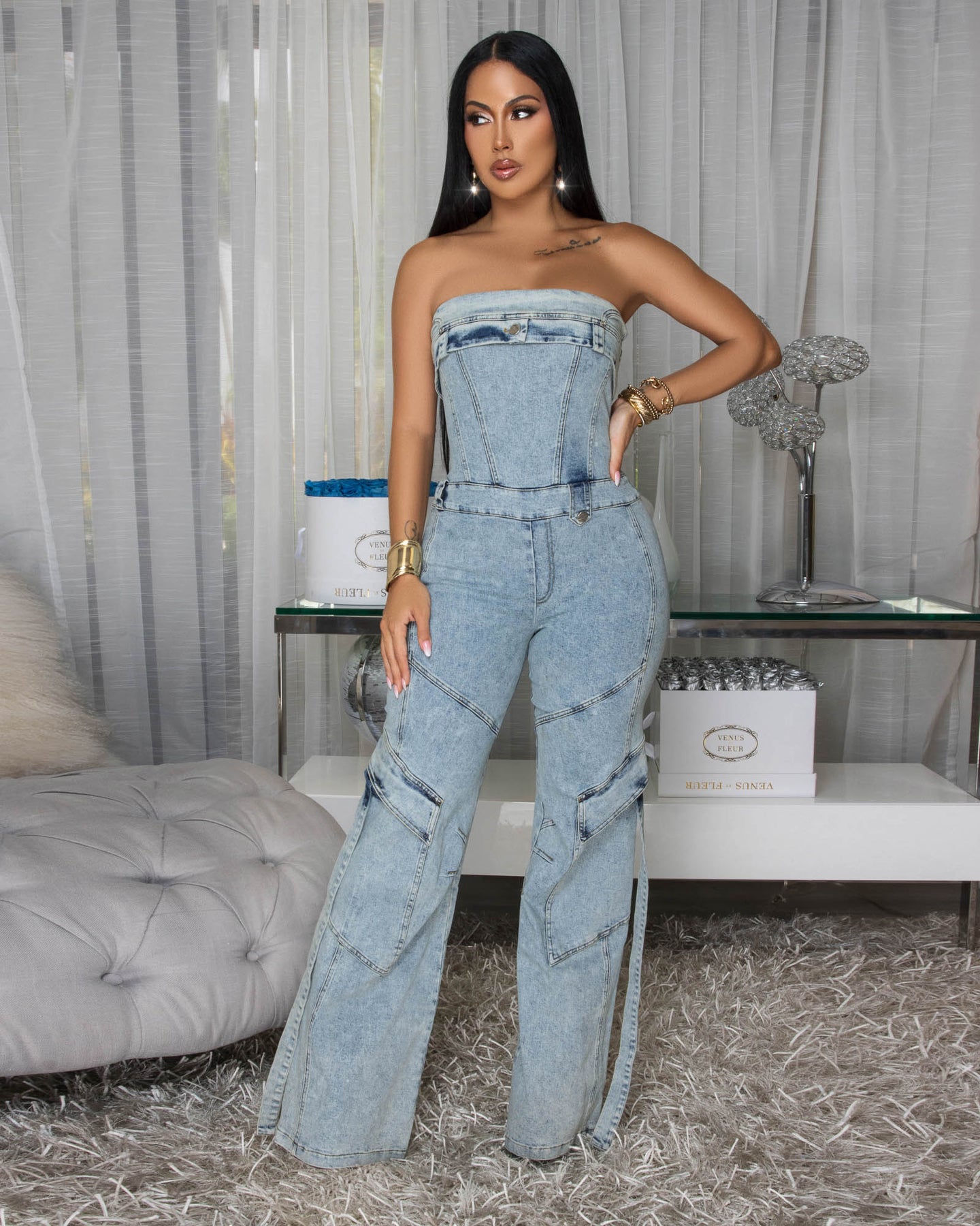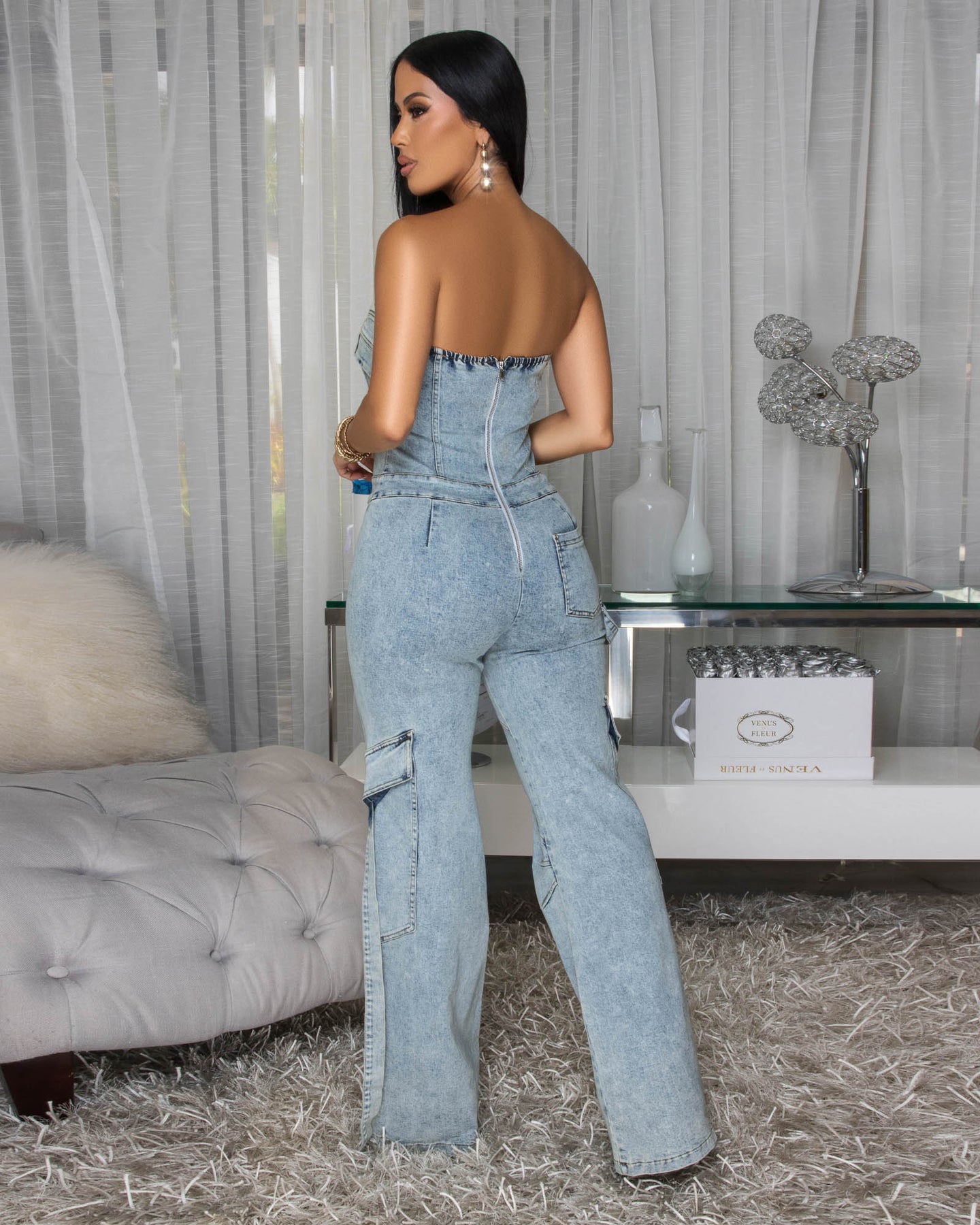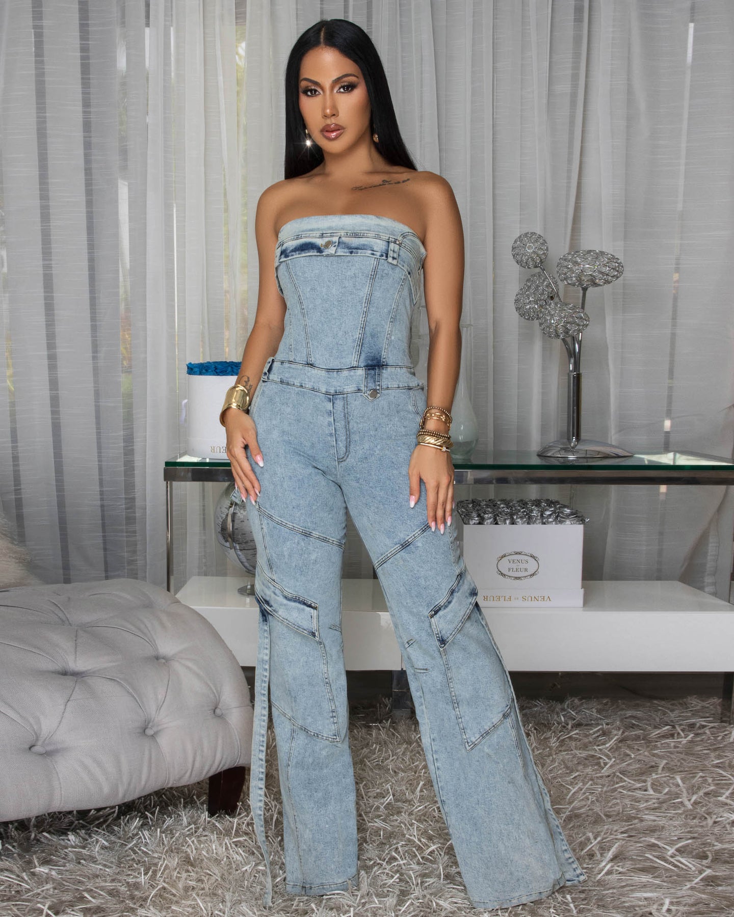 Orena Stone Acid Wash Denim Strapless Cargo Jumpsuit