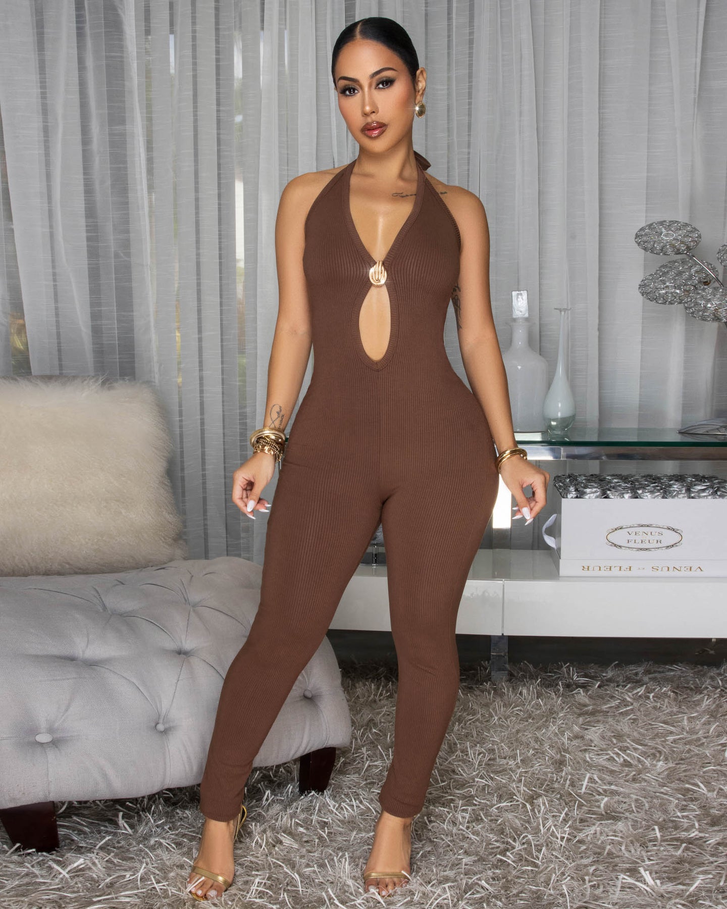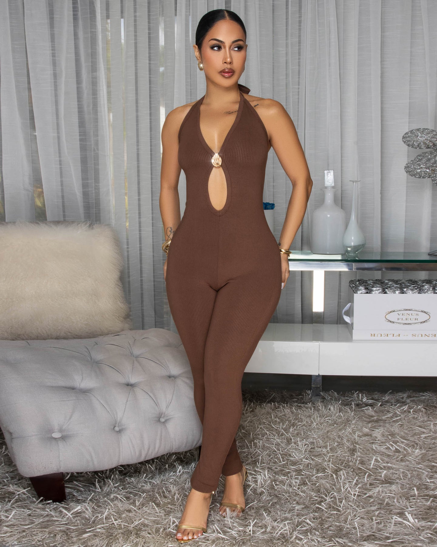 Rosalia Mocha Body-Con Ribbed Halter Jumpsuit