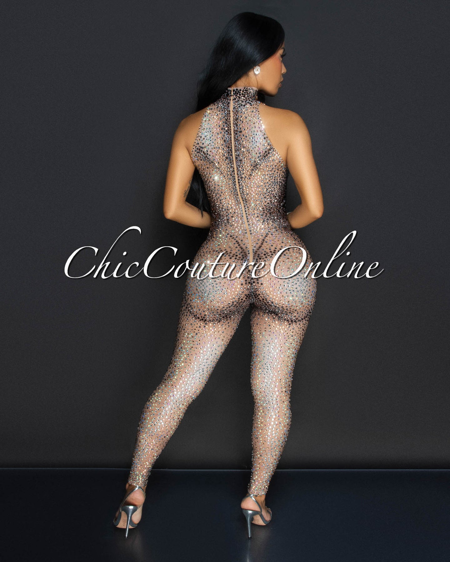 Textured with a sheer mesh and rhinestones, this evening jumpsuit boasts feminine detailing in a flirty silhouette.