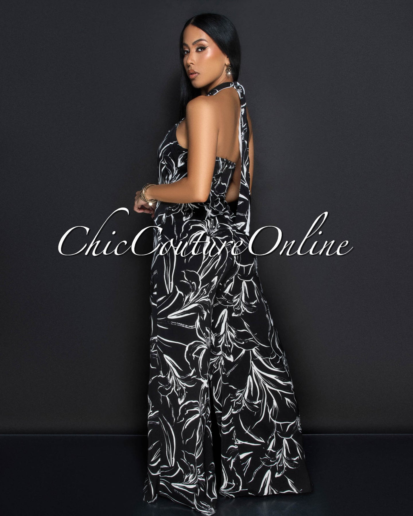 Xenora Black White Cross Halter Wide Legs Jumpsuit